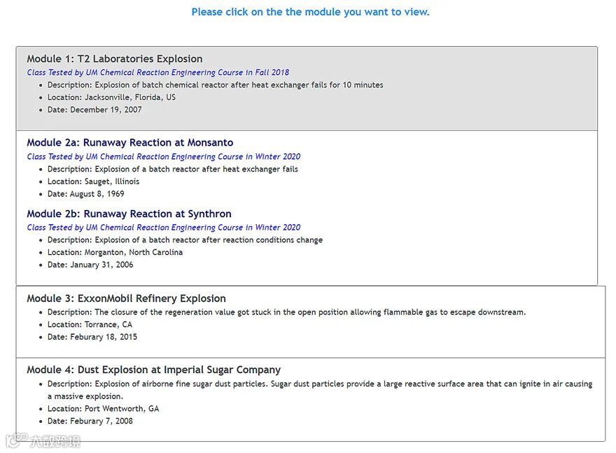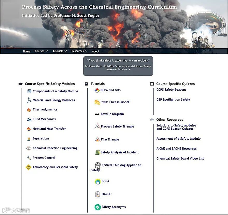 最近,本君在ACS Chemical Health & Safety 杂志上读到一篇关于化工安全培训的文章“Process Safety Across the Chemical Engineering Curriculum”,来自美国密歇根大学的H. Scott Fogler和Laura J. Hirshfield,介绍了他们做的化学安全网站SafeChemE。本君觉得这个网站上的安全知识和案例有助于大家提高安全意识、学习安全知识,今天拿来跟大家分享。