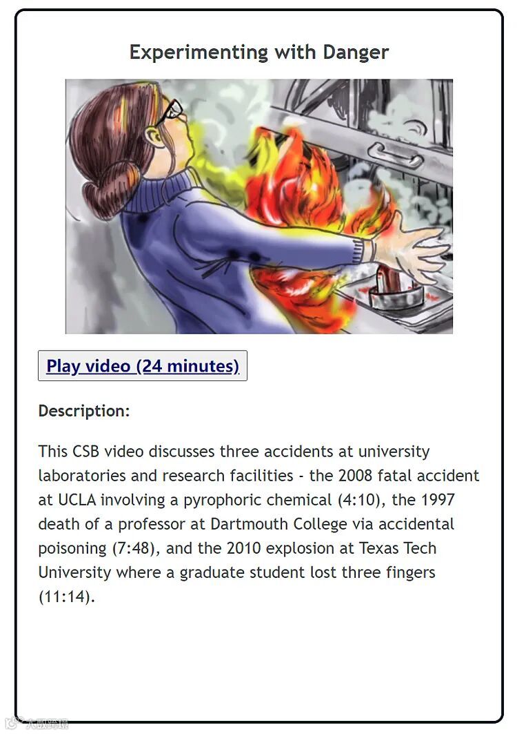 本君觉得,SafeChemE这个网站对化学化工行业工作者还是有一定的学习意义。我们都不想亲身经历安全事故,但是我们可以从其他事故中学会分析原因,审视我们的工作去发现隐患。安全实验、平安生产是每个从业者的希望。所以,请大家百忙之中抽出宝贵的时间去学习化学安全的相关知识。无论你的时间再宝贵,在事故面前都那么一文不值……