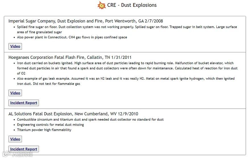 在网站的右侧栏,同样有很多值得挖掘的资源。比如,点击“Chemical Safety Board Video List”一项能看到很多已经分好类的视频,大多数事故视频下还配有分析报告。