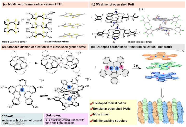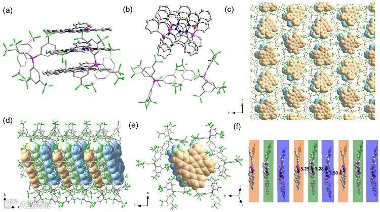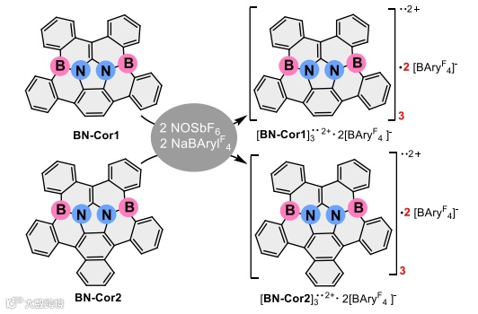 此外,两个抗衡阴离子的存在表明这种π-三聚体具有双阳离子性质。与中性前体的碗状不同,[BN-Cor1]3••2+和[BN-Cor2]3••2+中碗烯骨架为非平面形结构,外围芳香环向上或向下弯曲。三个碗烯被六个阴离子[BArylF4]-包围,阴离子[BArylF4]-占据了六边形结构的顶点。由于中性化合物BN-Cor1和BN-Cor2呈现出堆积结构,作者研究了[BN-Cor1]3••2+和[BN-Cor2]3••2+的堆积行为。结果表明,[BN-Cor1]3••2+和[BN-Cor2]3••2+中仍然观察到碗烯单元沿 a 轴的滑动堆积,相邻的碗烯单元呈现出ABC-ABC重复的堆积模式。碗烯堆积构成的柱状结构被阴离子很好地分隔开来。