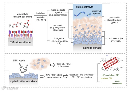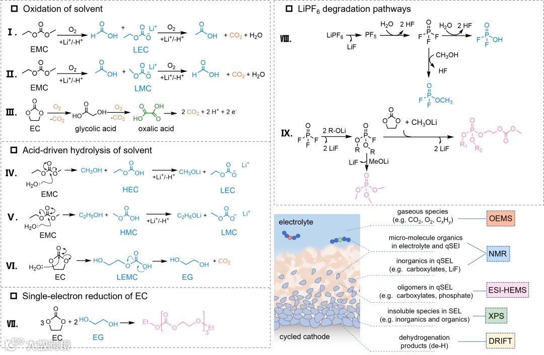 综合多种表征技术的特点(包括DRIFT、液态NMR、 ESI-HRMS、 XPS和OEMS),建立了一个全面的表征范式,复原完整的CEI。