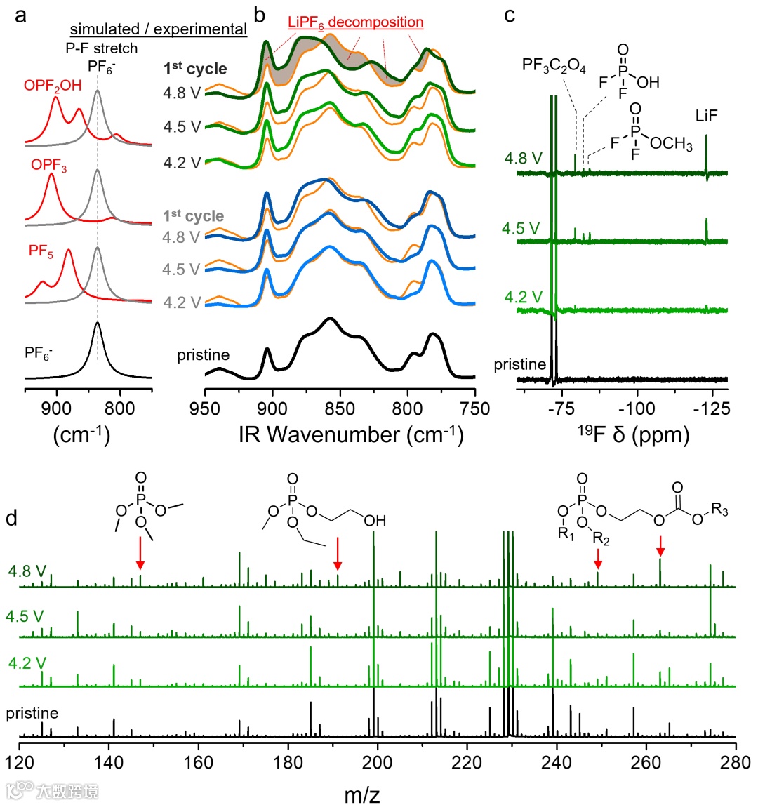 图4. (a)相关PF6-衍生物种的DFT-模拟的红外结果;(b)不同电压下NMC622的DRIFT光谱图(P-F振动区域)。(c)不同工作电压循环后的NMC622/Li半电池中提取的电解液的19F谱以及(d) ESI-HRMS谱(超纯水作为萃取剂)。