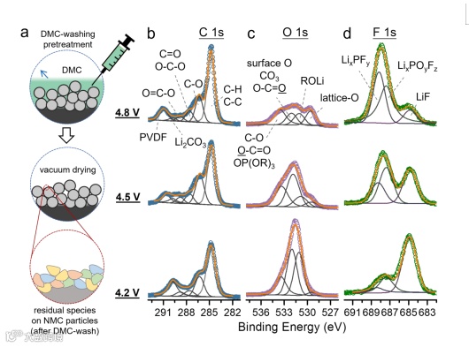 图5. (a)“洗后再测”模式的示意图。经DMC清洗后,循环后的NMC622电极的(b) C 1s, (c) O 1s 和 (d) F 1s 谱。