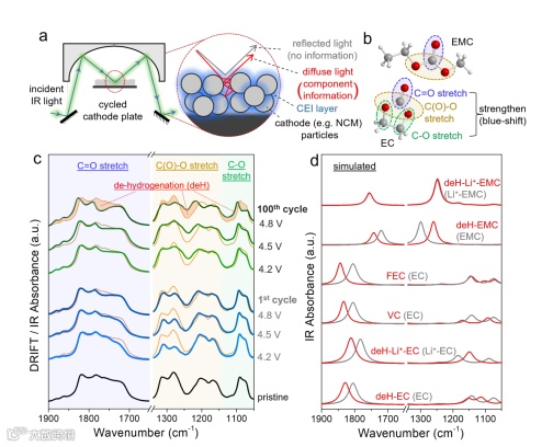 图2. (a)DRIFT的示意图;(b)充电过程中溶剂分子的化学键振动变化;(c)不同电压下NMC622的DRIFT光谱图(C=O和O-C-O振动区域)。纯电解质作为对照(黑色)。(d)相关脱氢中间体的DFT模拟的红外光谱。