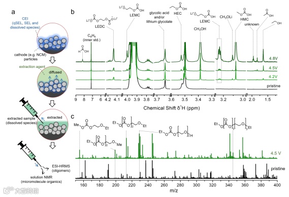 图3. (a)萃取示意图。(b)不同工作电压循环后的NMC622/Li半电池中提取的电解液的1H谱。(c)3.0-4.5 V循环的NMC622/Li半电池中提取的电解液的ESI-HRMS谱(萃取剂为乙腈)。