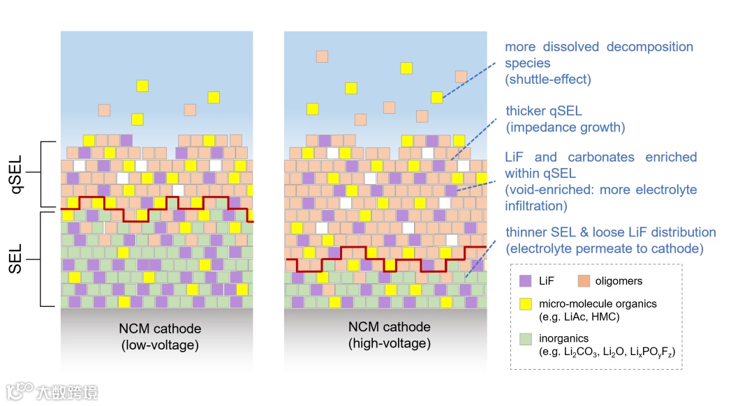 (4) 基于重建CEI模型,对高压电池的失效机制进行合理分析:溶剂脱氢分解更加严重,更厚的qSEL导致阻抗增大,同时抵御性产物LiF更多分散在qSEL中,导致CEI无法阻止电解质浸入正极。