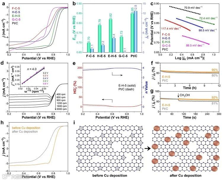 基于拓扑五元环、边界等本征缺陷打造高效碳基非金属电催化剂是近年来的研究热点。其中,富勒烯因其丰富的原生五元环、小分子形态、易自组装等突出特点,被视为构造富缺陷碳催化剂的新型前驱体。然而,高温下富勒烯是如何在分子水平先分解成微小的碳碎片,进而重组成富缺陷碳材料,人们仍知之甚少。受富勒烯在高温常压下可转化石墨化碳,而在高温高压下则转化为无定形/金刚石碳的启发,华中科技大学郭昆、卢兴教授团队打破常规,通过改变传统硬模板法中加热和蚀刻的先后顺序,研究了C60分子在不同空域条件下——开放(刻蚀再加热)和限域空间(加热再刻蚀)中的裂解重构。结果表明C60碎片的空间邻近度对碎片重组过程中的键合方式有重要影响,进而直接关联产物碳材料的电催化性能。开放空间中,自由的C60碎片倾向于在边界处以sp2键重新连接,形成更大的sp2杂化纳米片,并保留高密度的本征缺陷;而在限域空间内,相邻C60碎片中的五元环则以sp3键相连而重组,这不利于电子传递和活性位点暴露。因此,开放空间中重构的C60衍生碳材料因高本征缺陷含量而表现优异的氧还原电催化性能。该研究工作发表在化学领域顶级期刊Journal of the American Chemical Society 上。第一作者为李宁、郭昆。
