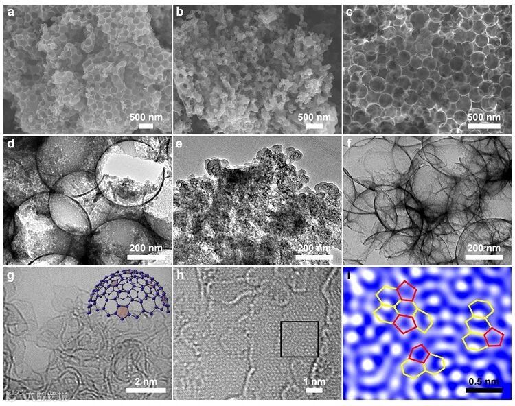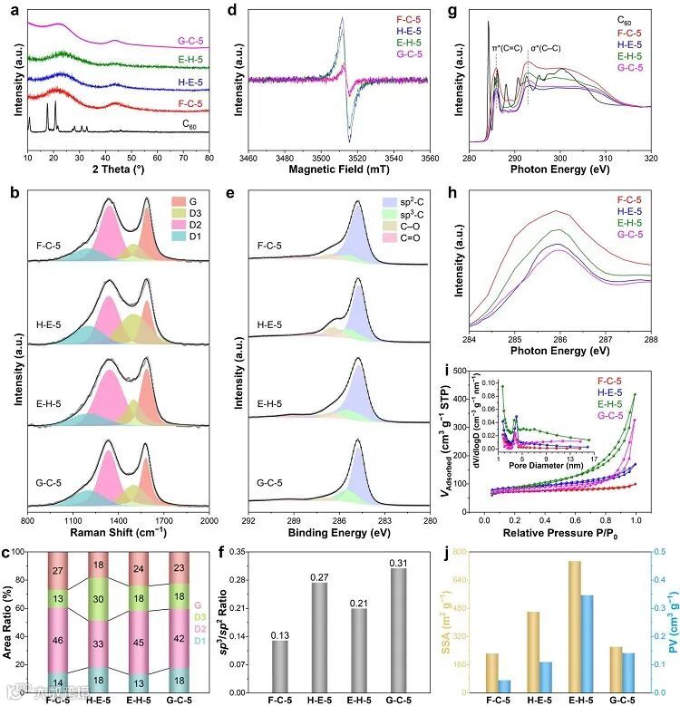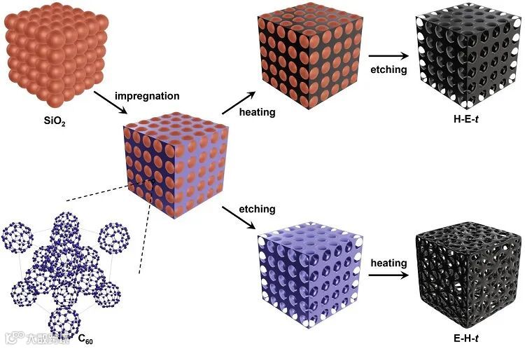 作者首先将C60分子浸渍到SiO2模板间隙中,得到C60@SiO2复合材料 (图1)。然后,将C60@SiO2进行“刻蚀+加热”和“加热+刻蚀”两种相反顺序的处理,产物分别命名为E-H-t 和H-E-t (t代表加热时间),以实现C60分子在不同空域条件——即开放空间 (SiO2在加热前蚀刻) 或限域空间 (SiO2在加热后蚀刻) 下的热解。作为对照,还制备了以不含五元环的葡萄糖为前驱体按照加热再刻蚀方式制备衍生碳材料 (G-C-5),以及C60粉末被直接热处理的衍生碳材料 (F-C-5)。