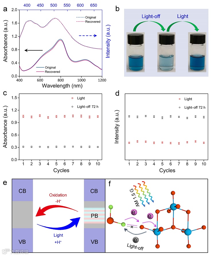 Figure 1. a) The recovered optical spectra of the oxidized 2D amorphous MoO3. b) Photographs of color changes for 2D amorphous MoO3 during the light irradiation-oxidization-reillumination process. c) UV-Vis-NIR absorption value (Light: the peak at 800 nm, light-off: the peak at 670 nm), and d) PL intensity (Emission peak: 505 nm) of 2D amorphous MoO3 over 10 switching cycles between light irradiation and light-off. e) Schematic diagram of the band structure evolution for 2D amorphous MoO3 during the light irradiation-oxidization process. f) Schematic illustration of the proposed electron transfer process of 2D amorphous MoO3 for reversible LSPR effect. Color code: Mo (blue), O (orange), H (green).