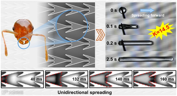图2. 仿蚂蚁颚部微结构设计液滴单向引导功能化表面