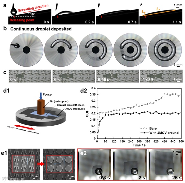 图3 仿生单向阀微结构的应用 a液滴沿 10° 倾斜面逆重力向上铺展。b液滴连续滴加在呈圆形排布的微结构表面。c将仿生单向阀结构放大 100 倍的 3D 打印试样可单向引导水流。d1-d2将仿生单向阀结构设计在摩擦副的非接触区,包围有仿生单向阀结构的表面摩擦系数曲线相对较低且稳定。e1-e2单向阀结构使前驱体膜可以在双方向铺展。