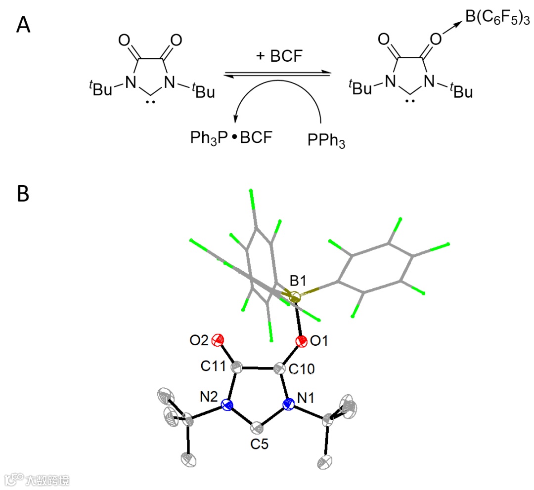 图3. (A)卡宾BCF-DAC的可逆配位过程;(B)卡宾BCF-DAC的晶体结构。