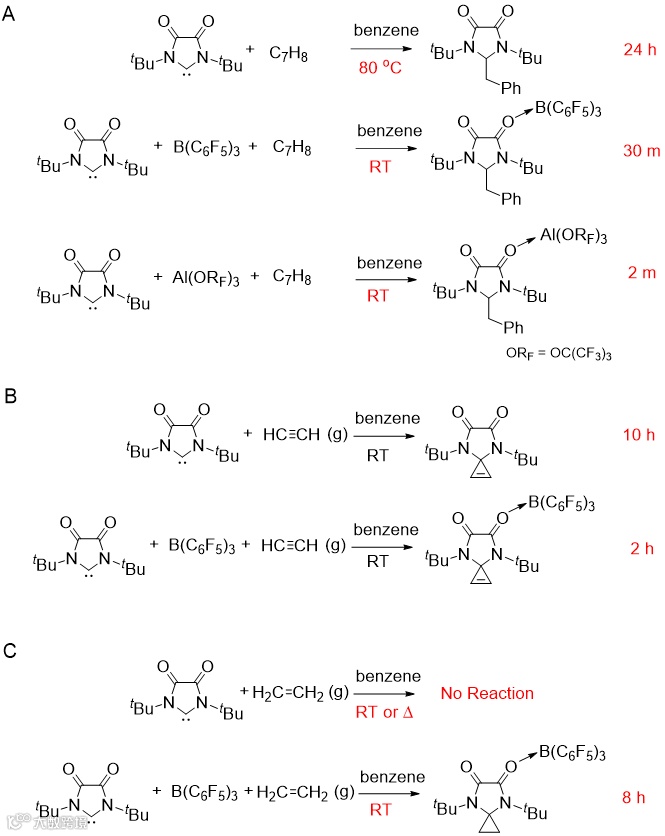 为了研究该卡宾与BCF配位前后反应活性的影响,该课题组将DAC与甲苯、乙烯和乙炔进行反应。DAC在加热至80 °C 后24至48小时可以插入甲苯的苄基C-H键。加入BCF后,DAC仅需30分钟即可在室温下完成反应,而使用更强的Lewis酸Al(O