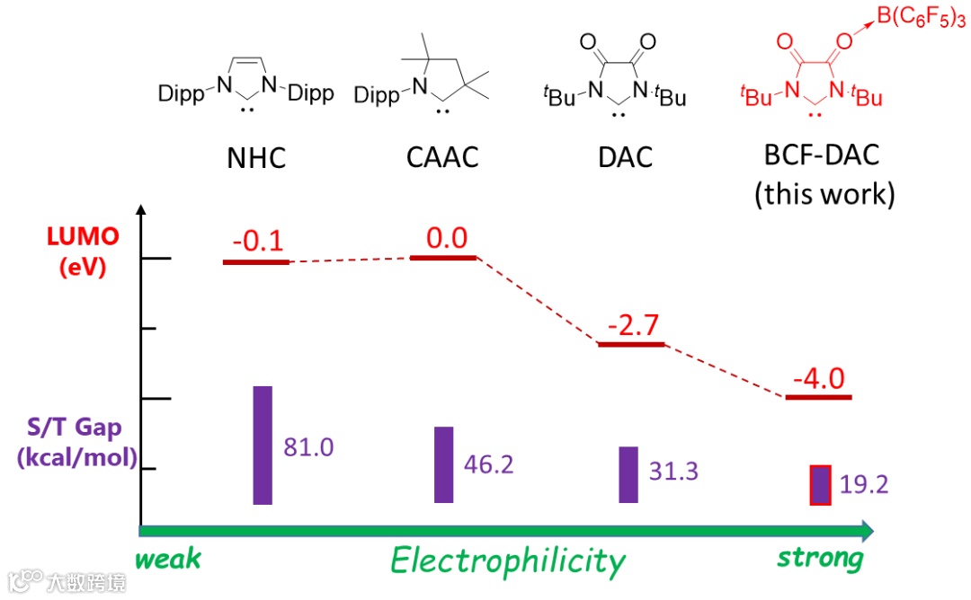 图2. 不同类型卡宾的LUMO能量和S/T Gap能量对比图。