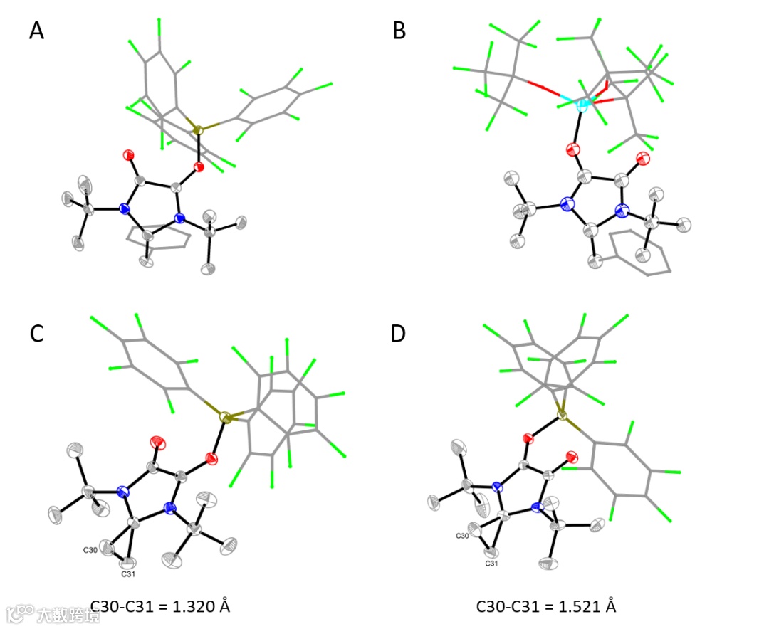 从10小时减少到2小时(图4B)。更引人注目的是,DAC即使在加热时也不会与乙烯反应,但在加入BCF后,常温常压下即可与乙烯发生[2+1]环加成反应(图4C)。由于其优异的亲电性,该杂化物成为首个能够直接与乙烯反应的稳定卡宾。所有产物均通过单晶X射线衍射(图5)和核磁共振等手段进行了表征。