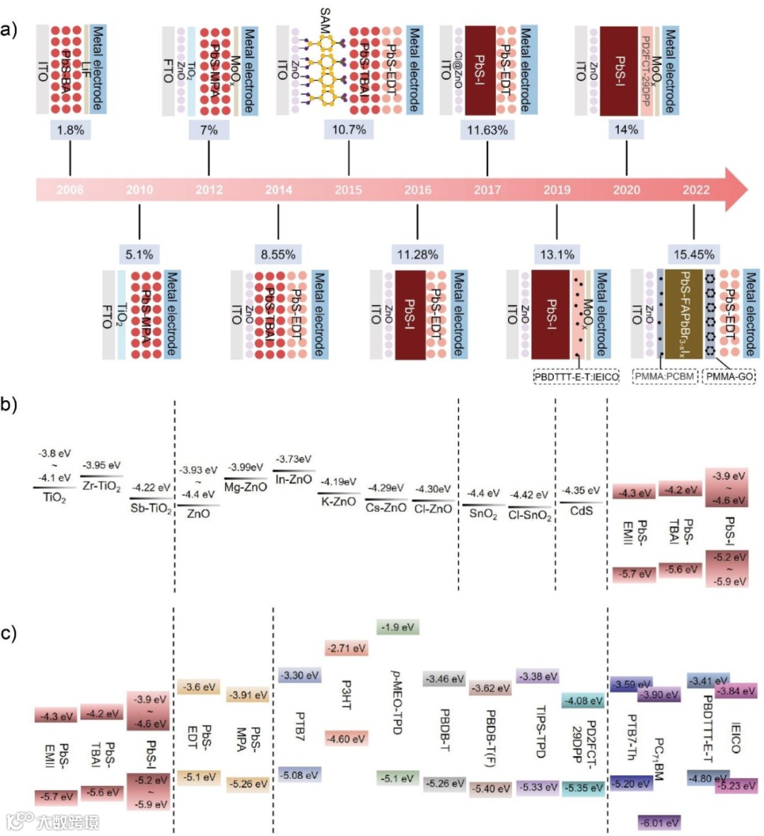 图1. (a) PbS CQD太阳能电池结构和光电转换效率的发展;(b)常用电子传输层材料能级;(c)常用空穴传输层材料能级。