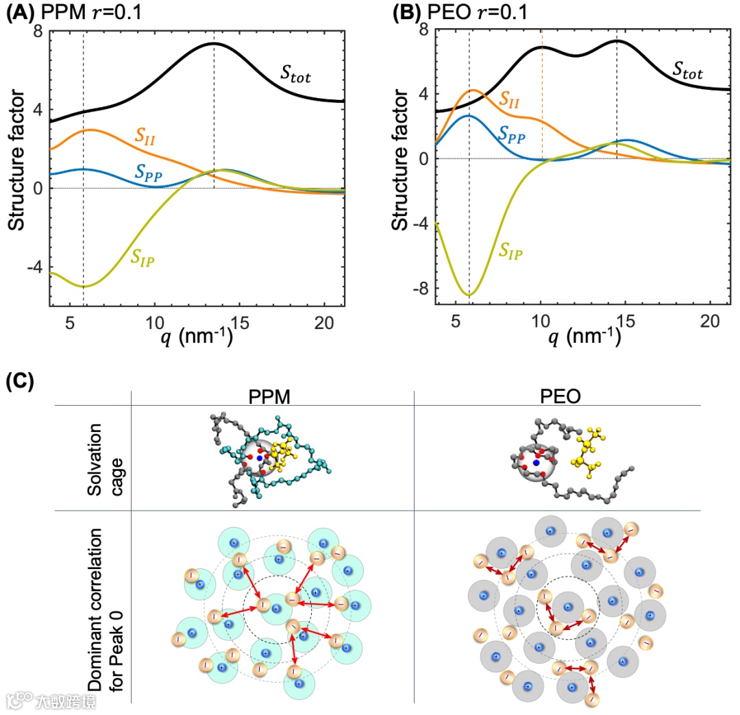 · 揭示了PPM中低波数区域的散射峰源于溶剂化牢笼结构与阴离子间的长程电荷有序排列。相反,PEO中该峰由受限于溶剂化牢笼结构之外的相邻阴离子间的相关性所产生。两种起源由PPM和PEO的不同离子溶剂化牢笼结构所决定(图2 C)。
