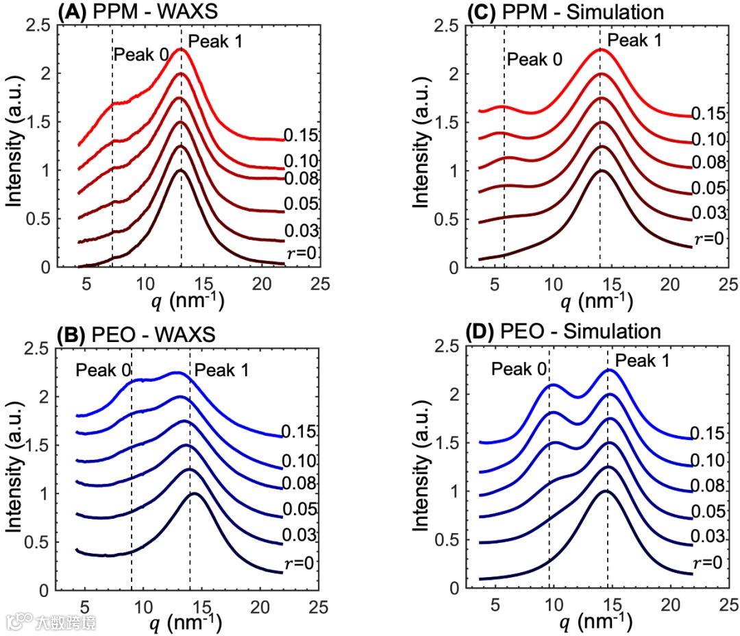 · 该工作将广角X散射和分子模拟相结合用以量化PPM和PEO电解质在散射行为方面的差异。实验和计算结果均表明,随着盐浓度增加,两种电解质中低波数区域的散射峰信号逐渐增强,但其位置和强度却显著不同(见图1)。