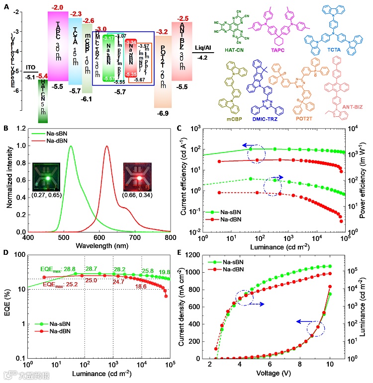 基于这两个材料制备的电致发光器件均展示了优异的性能,在磷光敏化剂的辅助下,兼具高效率、低滚降、高色纯度和长寿命等优点。Na-sBN和Na-dBN的电致发光器件最大外量子效率(EQE)分别高达28.8%和25.2%,即使在10000 cd m-2的超高亮度下,其EQE仍分别高达25.8%和18.6%。其中,基于Na-dBN的红光器件表现出非常接近美国国家电视标准委员会(NTSC)发布的纯红光标准的CIE色坐标,其最大EQE刷新了纯荧光红光OLED的最高记录。在100 cd m-2的初始亮度下,基于Na-sBN和Na-dBN的器件操作寿命分别为125447小时和33830小时。