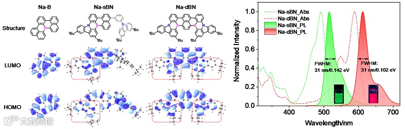 总得来说,该工作提出了一种新型的构建窄谱带纯荧光材料的策略,成功地将多重共振砌块和多环芳烃萘单元进行稠合,制备出了两例新颖的窄谱带纯荧光材料Na-sBN和Na-dBN。这类材料展现出了优异的窄谱带发光特性,具有极高的光致发光效率和稳定性,基于其制备的电致发光器件兼具效率高、滚降小、色纯度高和器件寿命长等优点。这一成果近期发表在Angewandte Chemie International Edition 上,深圳大学为唯一完成单位,文章通讯作者为深圳大学杨楚罗教授,第一作者是深圳大学博士后胡宇轩,深圳大学博士研究生黄曼莉为共同一作。该工作得到了国家自然科学基金委以及深圳市科技创新委员会的大力支持。