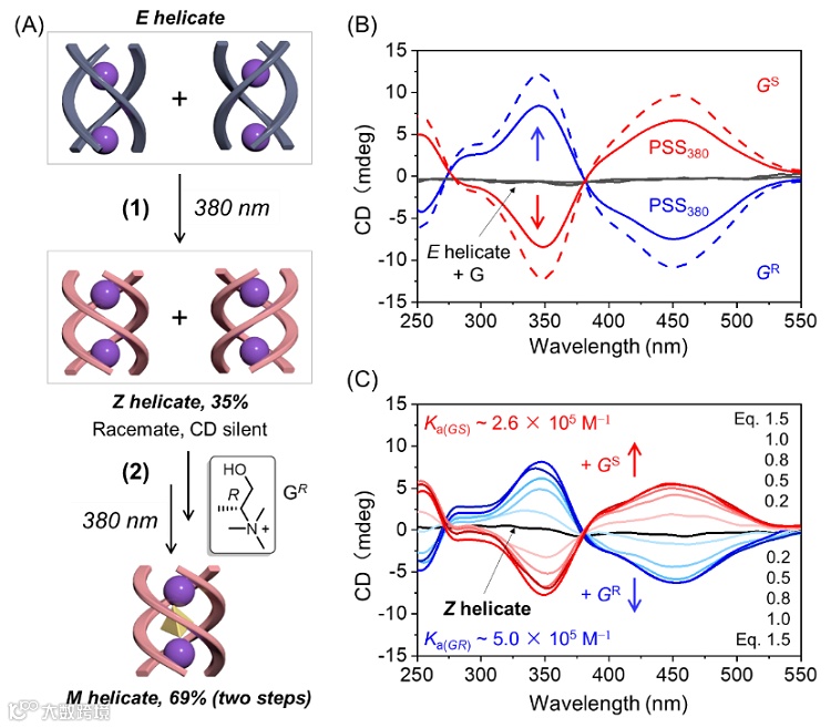 利用外部刺激调节超分子手性(如开/关、强度变化和手性反转)不仅有助于理解生命体中的手性行为,而且能够为设计传感、催化和数据处理的新型手性光学材料提供参考方法。鉴于顺式三股螺旋体优异的客体结合能力,以α-甲基胆碱衍生物作为手性客体,通过光照和手性客体引发诱导了同手性三股螺旋体的形成。圆二色光谱(CD)证实了光激发-手性结合的串联作用对手性三股螺旋体的调控,如图4所示。