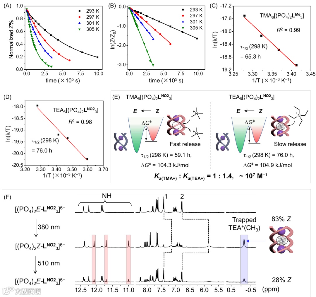 , 9389-9394)。近期,利用偶氮苯骨架的多脲配体与磷酸根离子的配位作用,偶氮苯的顺-反异构化行为能够控制组装结构(四面体笼和三股螺旋体)的可逆变化。在此基础上,为了厘清组装结构对偶氮苯光异构化行为的影响,他们系统研究了三股螺旋体的光异构过程。实验结果表明:偶氮苯光异构化过程中,三股螺旋体发生了“原位”光异构化现象(如图1B所示);这与普遍认知的“解离-光异构化-重组”过程明显不同。