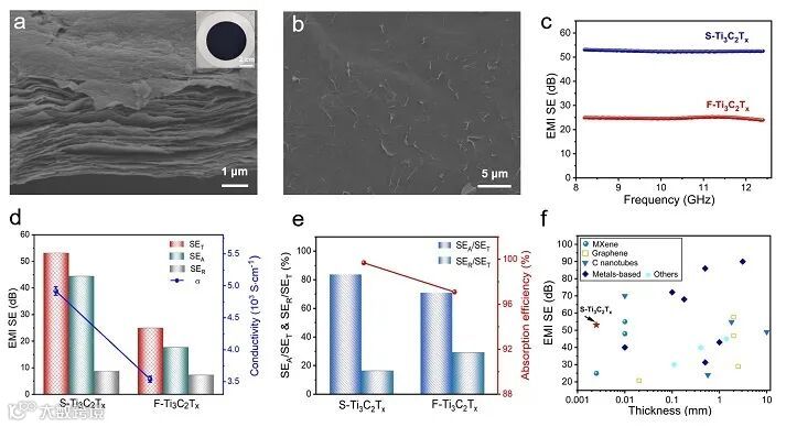 薄膜的吸收/反射屏蔽性能比和电磁波吸收效率;(f)不同材料的总电磁干扰屏蔽效率与厚度的关系。