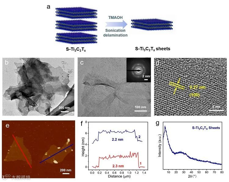 片的TEM图像;(e)原子力显微镜图像以及(f)相应的高度剖面图;(g)S-