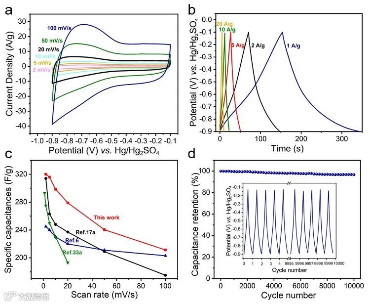 电极在2 mV/s的条件下可提供320 F/g的