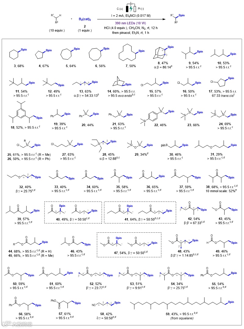 该合成策略:(1)无需任何过渡金属参与反应,反应条件温和,操作简单,可扩展性强以及高效的流动反应证明该方法具有很大的工业应用潜力;(2)该方法表现出了非常广泛的底物适用范围和对不同碳氢化合物的良好耐受性——简单烷烃、卤化物、硅烷、酮、酯和腈都可以参与反应(图2)。