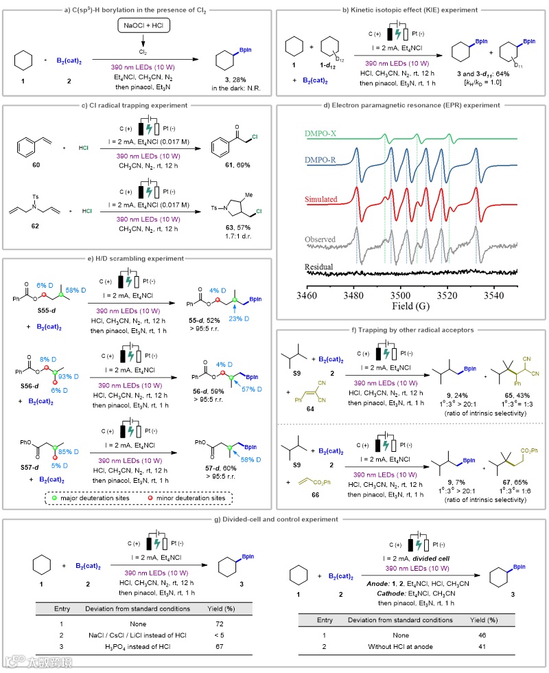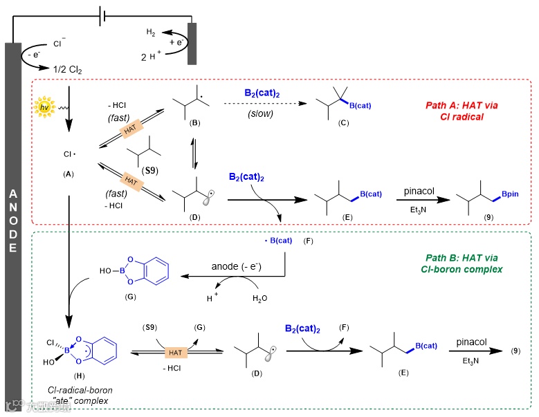 免受阴极的单电子还原而非氯源的关键作用。作者通过分电池实验(图4g)进一步证实HCl在反应中的作用。此外,为了进一步揭示光电化学条件下的HAT物种,作者进一步进行了更多的机理实验(详见文章补充信息)。实验结果表明,在反应过程中,游离的Cl自由基和Cl-硼络合物都可能是HAT物种。