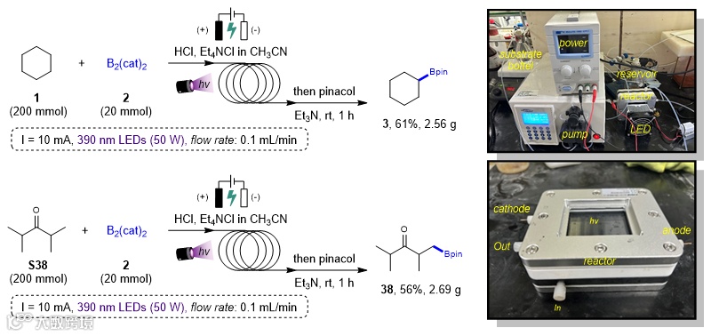 为了进一步证明这种光电化学方法的合成潜力,作者通过将已有的光电化学合成策略进行改进,成功的将这种批处理方案转化为可扩展的连续流动合成方式,这种可持续流动的合成方式,可以很好的适用于碳氢化合物与