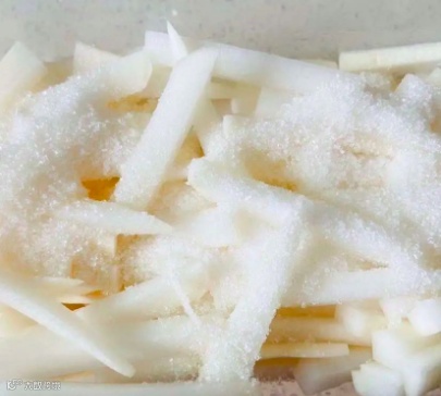 加入盐糖腌制萝卜条,把密封罐放入冰箱冷藏室腌制一夜。随后,倒掉罐内水分,洗净沥干。