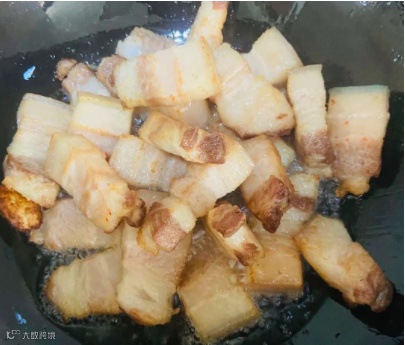 油锅爆香后,倒入五花肉,煸炒至肉香味飘出。