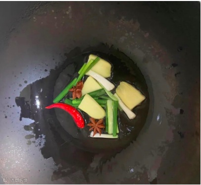 锅里放少许油,油热后,放入葱段、姜片、八角、辣椒爆香。