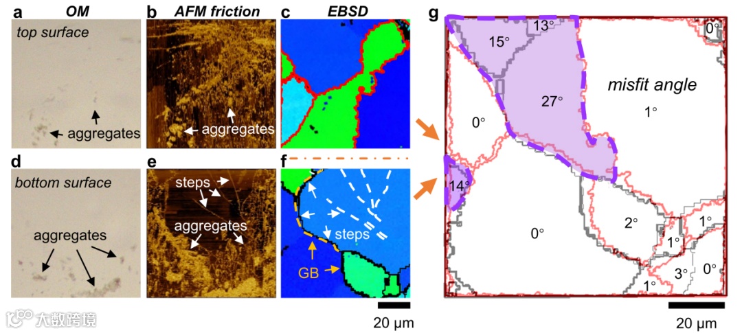 基于该技术,亚毫米HOPG石墨方块的剪切界面首次被打开。如图3所示,采用原子力显微镜(AFM)、电子背散射衍射(EBSD)、拉曼光谱和俄歇电子能谱(AES)对接触界面的两侧进行了系统的表征,并在界面发现了三种缺陷结构:共度晶粒(commensurate grains)、外台阶(external steps)和碳杂质(carbon aggregates)。EBSD结果表明,亚毫米石墨剪切界面是由多晶组成的,且可能含有共度晶粒,这与微米尺度石墨剪切界面的单晶非共度界面并不相同。结合晶粒信息和AFM图像,我们发现了两种不同的表面台阶。一种可能与晶界重合,另一种位于单个晶粒内部,这表明二者的形成机制可能是不同的。
