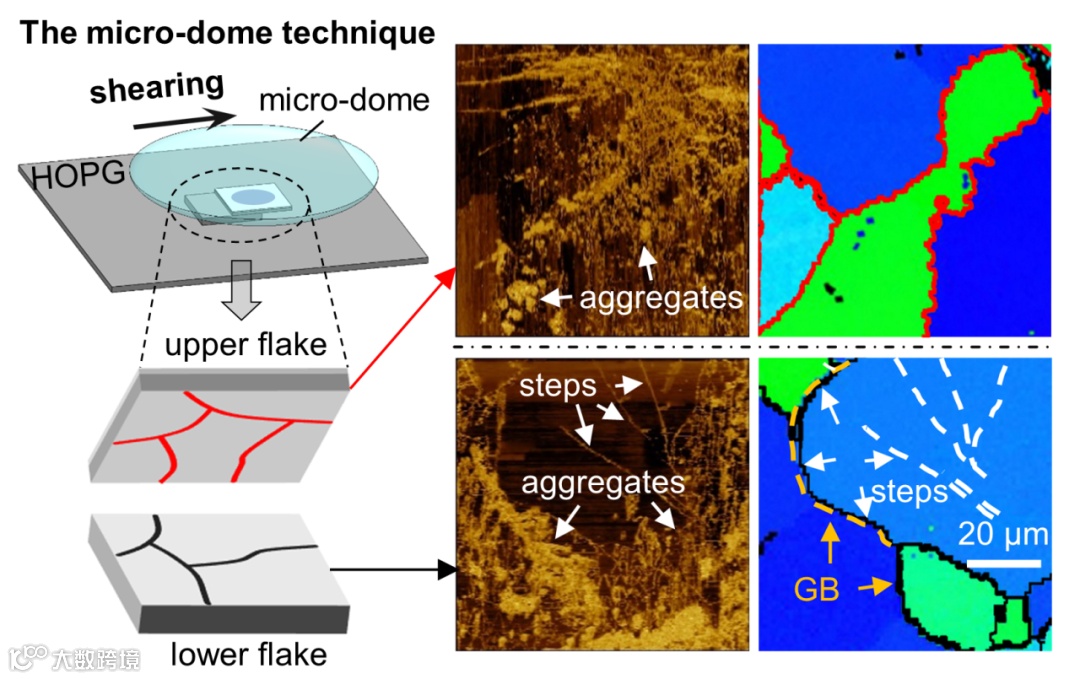 研究团队将微触头技术应用于操纵亚毫米石墨剪切界面,最大操纵面积达到了1 mm2,是以前基于探针的技术(400 µm2)的2500倍。研究者采用原子力显微镜(AFM)、电子背散射衍射(EBSD)、拉曼光谱和俄歇电子能谱(AES)对接触界面的两侧进行了系统的表征,在界面处发现了三种缺陷结构,即共度晶粒、外台阶和碳杂质。进一步,对微触头技术的力学分析为合理选择微触头材料和设计其尺寸提供了理论指导。最后,研究者开发了一种集成微触头技术的双轴力测量装置,测量了100×100 µm2石墨剪切接触的法向力和侧向力。本项工作为未来研究跨尺度的结构超滑现象和操纵层状材料提供了平台技术。