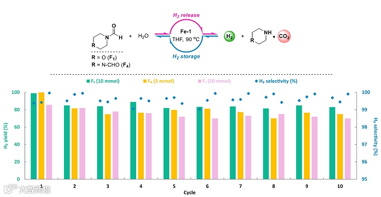 基于铁-钳形配合物在可逆催化加氢、脱氢反应体系中表现出的优异的稳定性和可复用性,作者在10次氢气储放循环测试中得到了>99%的选择性和>70%的储放效率,极大避免了每次储氢循环之间储氢介质的损失和不必要的碳排放,从而实现了碳中和的储氢和放氢体系。并且测得氢气中CO含量低于10 ppm,因而可以减少对氢燃料电池催化剂造成的毒害作用。该储氢系统工作