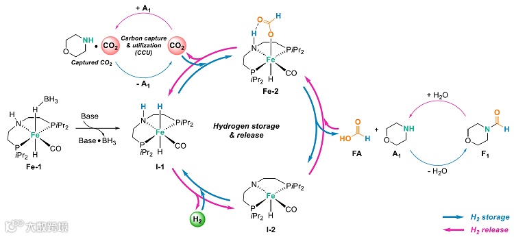 图2. 基于甲酰胺双功能作用的铁-钳型(pincer)配合物催化的碳中和氢气存储与释放循环。图片来源: