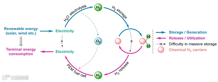 氢能因其绿色低碳、来源丰富被誉为21世纪最具发展潜力的清洁能源。在“双碳”背景下,构建可再生能源与氢能供给的"电-氢体系"可以促进可再生能源的大规模消纳,加速推进各领域的低碳化进程(图1)。相较于传统的物理储氢手段,基于不饱和底物的可逆催化加氢、脱氢反应为氢气的化学存储提供了高效且安全的适用方法。然而,以贵金属为主的过渡金属催化剂仍主导着这一领域。近日,
