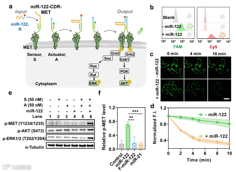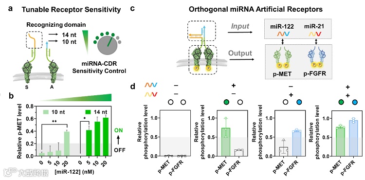 之后,作者成功构建了miRNA-CDR,其能够特异性的响应靶标miR-122,并且激活肝细胞生长因子受体(MET)自磷酸化和下游信号转导通路(图3)。通过改变传感器模块中的识别结构域长度,能够以可调的灵敏度响应用户定义的miRNA。MiRNA-CDR中的靶标miRNA的识别输入模块和受体靶向的信号输出模块可以进行用户定制,作者最终在同一细胞群体中实现了两种指定miRNA驱动的受体信号激活的正交调控(图4)。