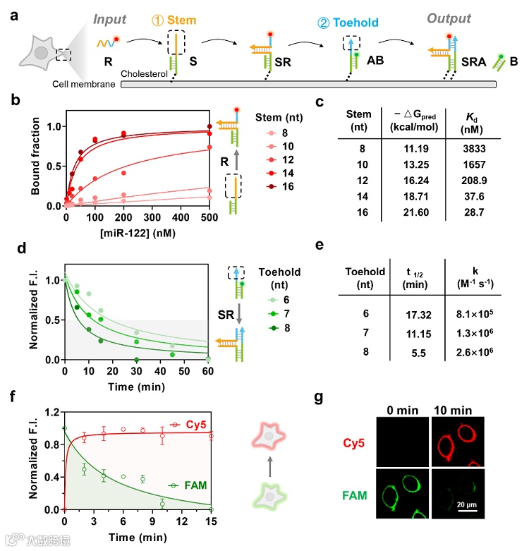 为了探索miRNA驱动的miRNA-CSD反应的可行性,作者在活细胞膜上构建了miRNA-CSD系统,其传感器模块中的茎结构域(Stem)