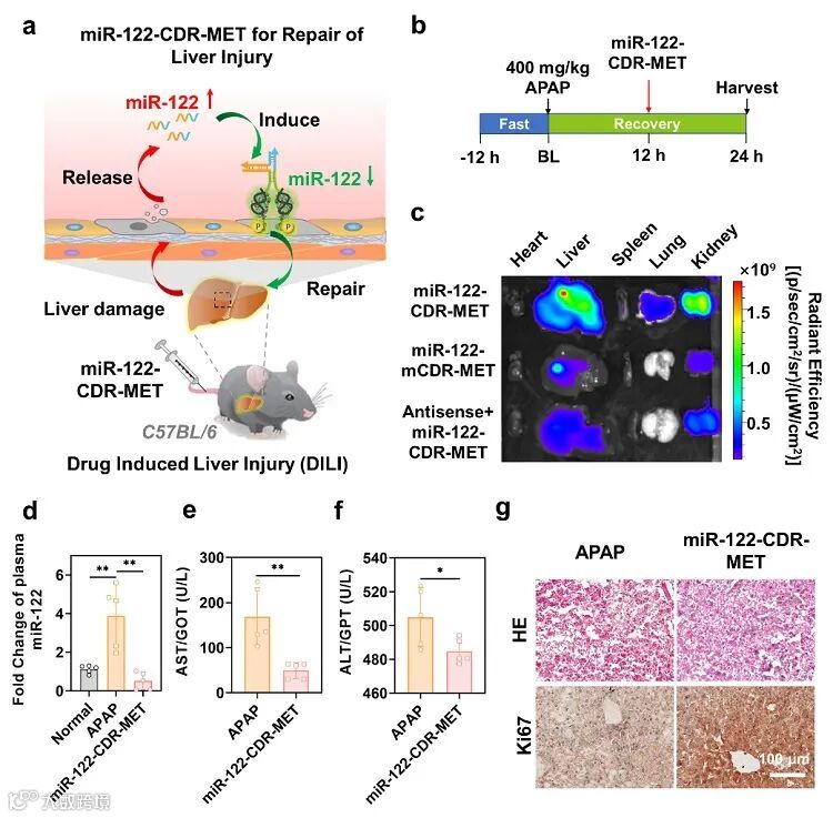 图5. MiR-122-CDR-MET促进药物诱导的急性肝损伤的修复。
