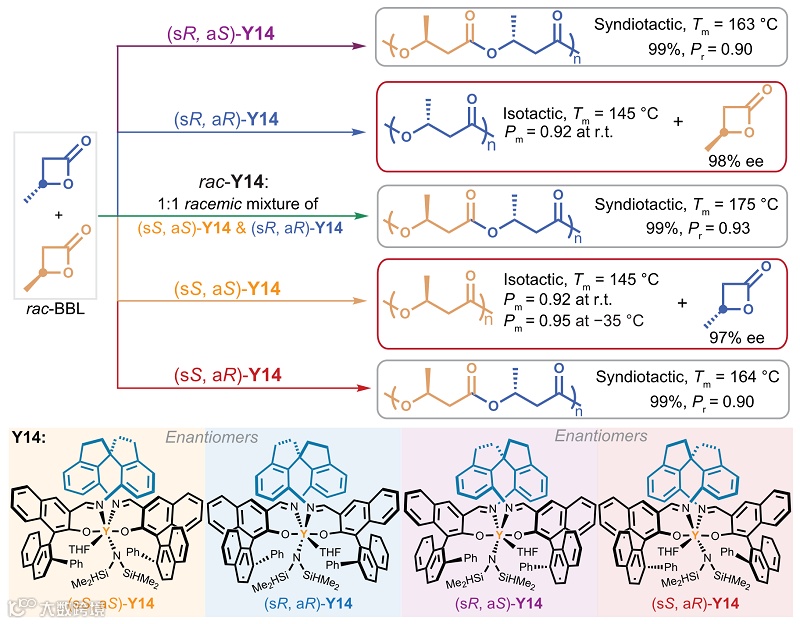 最后该团队使用rac-Y6和rac-Y14催化了rac-BBL和外消旋β-戊内酯(rac-BVL)的开环共聚合反应(Fig 5.),通过改变rac-BBL和rac-BVL的比例,制备了一系列共聚物。rac-Y6催化的共聚合反应,BBL和BVL单体表现出相似的活性,得到了一组无规但高度间同的聚合物。rac-Y7催化的共聚合物反应,BBL单体活性高于BVL单体,因此得到了一类嵌段且高度间同的聚合物。核磁共振碳谱和动力学实验证明了这些聚合物的序列结构和立体规整度,这些聚合物的熔融转变温度在108–159 °C之间,抗拉强度 23.3–32.9 MPa之间,断裂伸长率在274–505%之间,性能可以媲美商用聚丙烯材料。