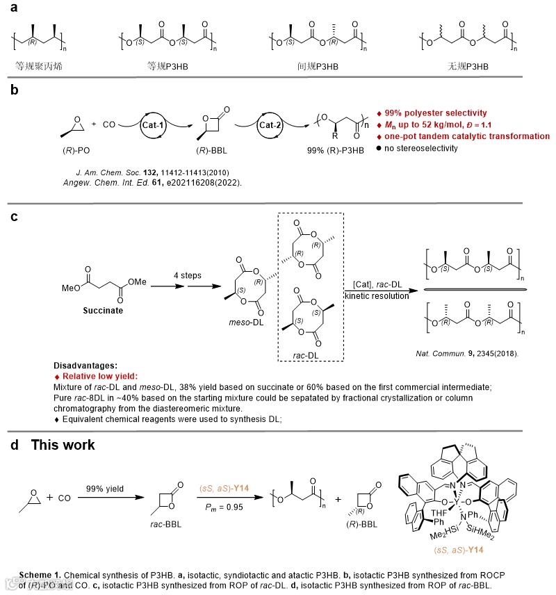 化学合成P3HB面临立体选择性的难题:非立体选择性合成的无规P3HB材料 (Pm≈ 0.50) 为油状液体缺乏力学性能。自1961年外消旋β-丁内酯 (rac-BBL) 开环聚合制备无规P3HB被首次报道以来,大量工作致力于从商业可得的rac-BBL立体选择性开环聚合制备等规P3HB。然而数十年过去,由rac-BBL直接得到高等规度,高分子P3HB的结果仍然不理想。目前为止,化学合成高等规度P3HB的途径仅有两个:从手性环氧单体和一氧化碳出发一锅法串联反应,开环共聚合制备等规度P3HB,这种方法需要光学纯的原料 (scheme 1b);从外消旋八元环内酯Diolide立体选择性聚合制备等规P3HB,Diolide的合成繁琐、产率较低并且外消旋Diolide是从非对映异构体中拆分得到的 (scheme 1c)。