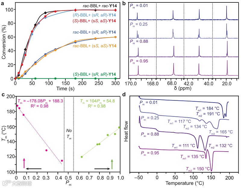 Fig. 4. Stereoselectivity study for ROP of rac-BBL. (a) Time-conversion plots of rac-BBL, 2.0 M in toluene, room temperature (rt), [rac-BBL]/[Y]/[I] = 200/1/1. (b) 13C NMR spectra (CDCl3) of P3HB samples with Pm values of 0.01, 0.25, 0.88, and 0.95. (c) Pm-Tm summary. (d) DSC curves of P3HB samples with Pm values of 0.01, 0.25, 0.88, and 0.95.