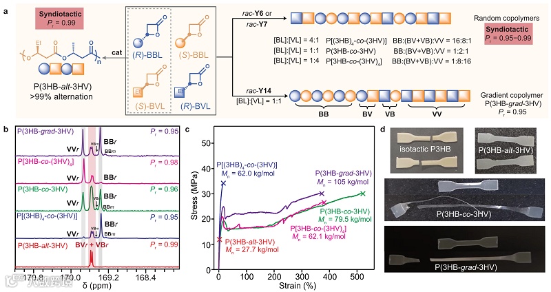 Fig. 5. Copolymerization study of rac-BBL and rac-BVL. (a) Copolymerization study of rac-BBL and rac-BVL and the microstructures of copolymers P(3HB-alt-3HV), P[(3HB)4-co-3HV], P(3HB-co-3HV), P[3HB-co-(3HV)4] and P(3HB-grad-3HV). (b) 13C NMR spectra of copolymers P(3HB-alt-3HV), P[(3HB)4-co-3HV], P(3HB-co-3HV), P[3HB-co-(3HV)4], and P(3HB-grad-3HV). (c) Stress-strain curves of copolymers P(3HB-alt-3HV), P[(3HB)4-co-3HV], P(3HB-co-3HV), P[3HB-co-(3HV)4], and P(3HB-grad-3HV). (d) Photographs of the PHA sample films.