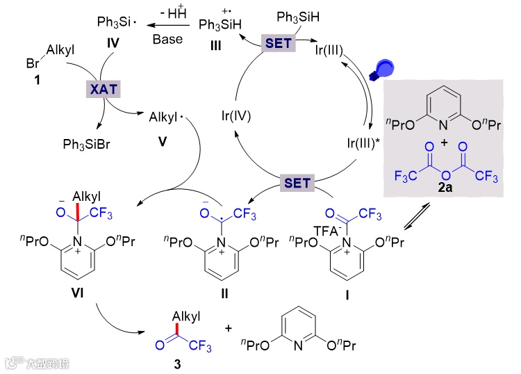 的生成巧妙地避免了游离三氟乙酰基自由基快速脱除羰基副反应的发生。Ir(IV)单电子氧化三苯硅烷进而再生Ir(III)并且形成阳离子自由基中间体