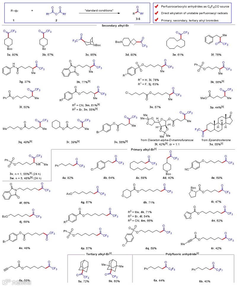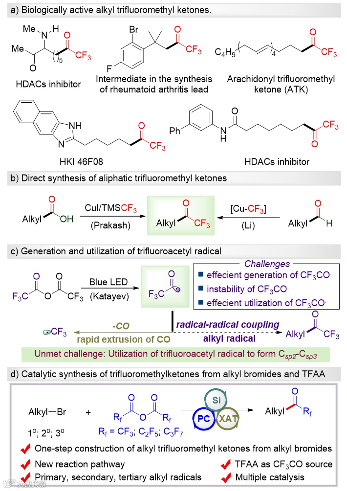 (图1d)。该反应使用可见光引发的接力催化,通过瞬态保护的三氟乙酰基自由基等价体的生成策略有效避免了三氟乙酰基的多种副反应,进而发生后续的自由基烷基-烷基偶联,成功实现了经济易得的三氟乙酸酐与烷基溴代物的烷基三氟乙酰化反应。该反应适用于一级、二级和三级烷基溴的高效三氟乙酰化。同时,该反应条件还可以进一步拓展到其它全氟烷基酰基化反应。该成果近期发表于《