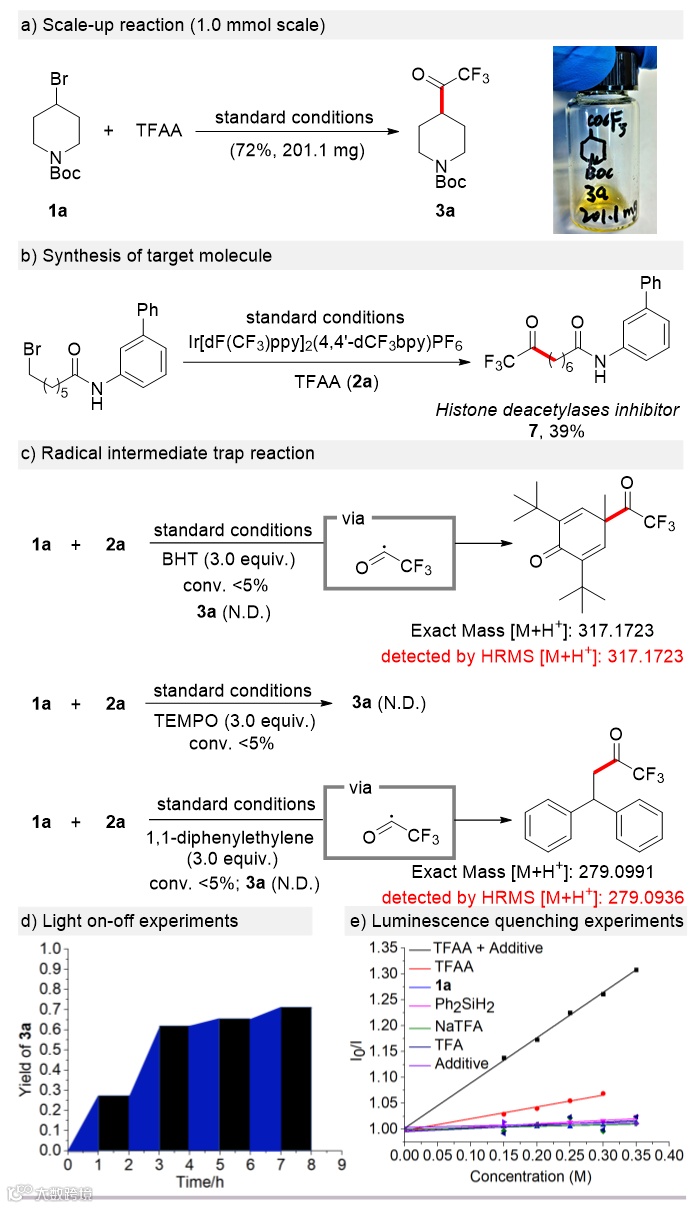 为了进一步验证该反应的普适性和实用性,作者对可见光催化烷基溴代物的三氟乙酰化反应进行了放大实验。将反应放大至1 mmol规模时,仍然可以以72%的收率得到目标产物(图3a)。值得一提的是,该反应可以一步合成广泛应用于生物医学等领域的组蛋白去乙酰化酶抑制剂药物活性分子